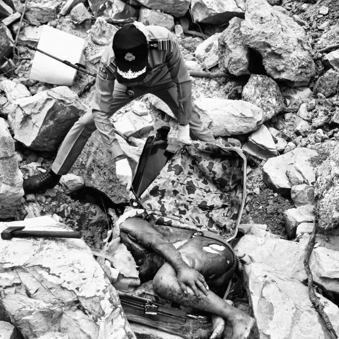 ក្នុងខណៈពេលកំលាំងចម្រុះចុះពិនិត្យសាកសពនោះឃើញថា សាកសពមិនស្គាល់អត្តសញ្ញាណ អ្វីទាំងអស់ ប៉ុន្តែដឹងថា មានភេទប្រុសជនជាតិខ្មែរ នឹងនៅលើដើមដៃឆ្វេងមានចាក់សាក់ជាអក្សរខ្មែរថា (ចងចាំ) ដោយសរសេរលេខខ្មែរនៅខាងក្រោម០៥.០៩.២១ ហើយសាកសព មានសភាពហើមធុំក្លិនមាននិងដង្កូវចុះ ។