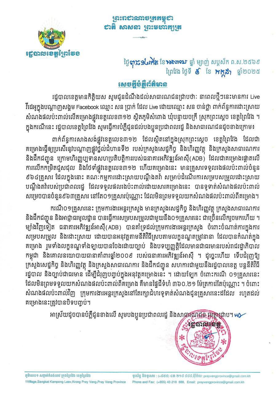 រដ្ឋបាលខេត្តមានកិត្តិយស សូមជូនដំណឹងដល់សាធារណជនជ្រាបថាៈ នាពេលថ្មីៗនេះមានការ Live វីដេអូក្នុងបណ្តាញសង្គម Facebook ឈ្មោះ សន ប្រាក់ ដែល Live ដោយឈ្មោះ សន ចាន់ថ្លា ពាក់ព័ន្ធការដោះស្រាយ សំណងផលប៉ះពាល់លើគម្រោងផ្លូវខេត្តលេខ៣១២ ស្ថិតភូមិសំពោង ឃុំបន្ទាយចក្រី ស្រុកព្រះស្តេច ខេត្តព្រៃវែង ។