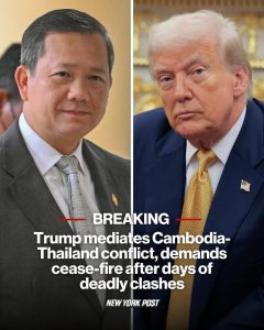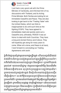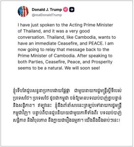 After he had spoken with His Excellency Phumtham Wechayachai, the acting Prime Minister of Thailand, Honorable President Donald Trump conveyed to me a positive piece of news that the Thai side also agreed to Honorable President’s proposal for an immediate ceasefire. This is really great news for the soldiers and people of both countries.