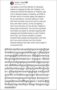 យប់ថ្ងៃសៅរ៍ទី ២៦ កក្កដា ២០២៥ ខ្ញុំបានពិភាក្សាតាមទូរសព្ទជាមួយឯកឧត្តម Donald Trump ប្រធានាធិបតីសហរដ្ឋអាមេរិក ពាក់ព័ន្ធនឹងការប្រយុទ្ធគ្នាដោយប្រដាប់អាវុធនៅតំបន់ព្រំដែនកម្ពុជា-ថៃ។