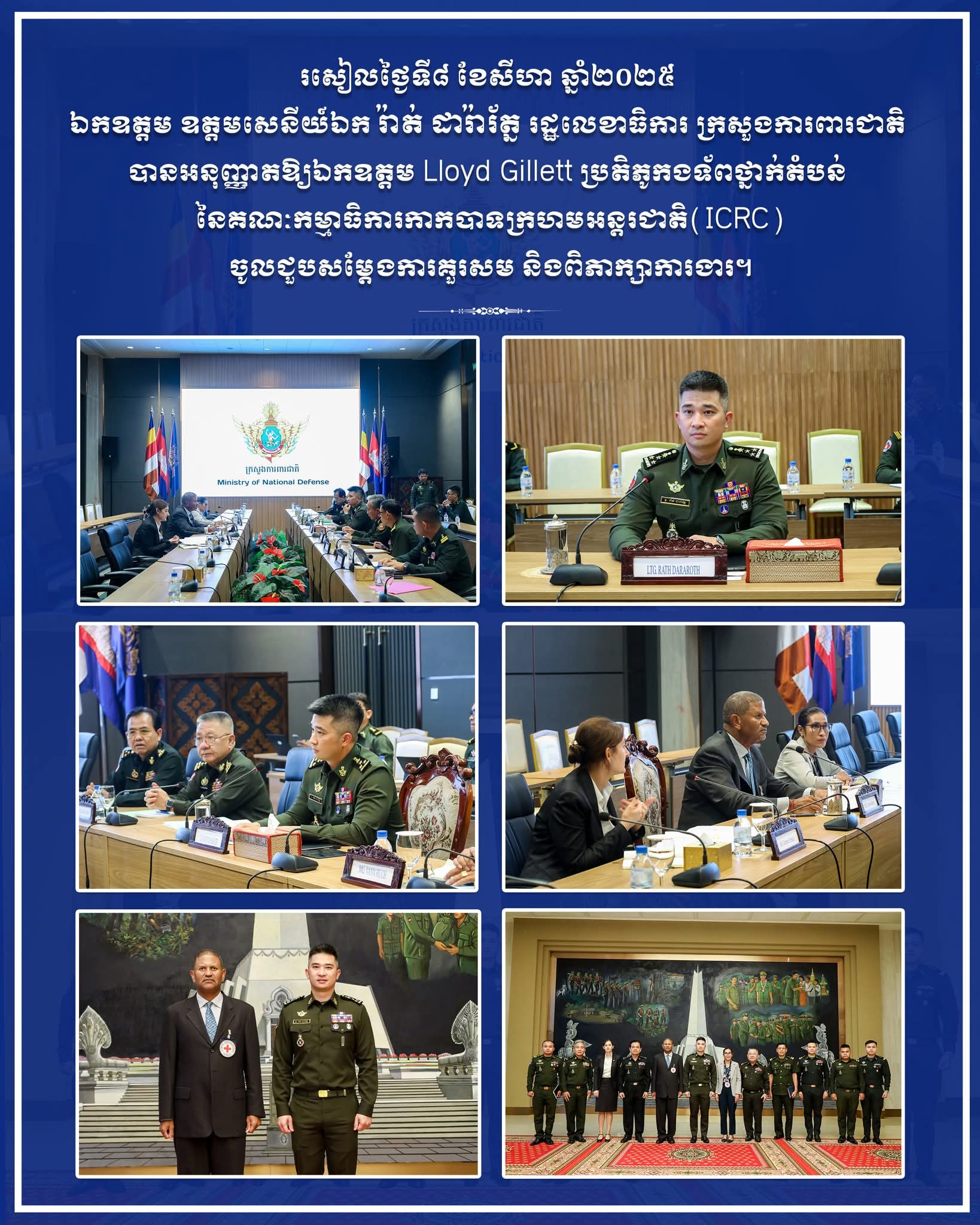 រសៀលថ្ងៃទី៨ ខែសីហា ឆ្នាំ២០២៥ ឯកឧត្តម ឧត្តមសេនីយ៍ឯក រ៉ាត់ ដារ៉ារ័ត្ន រដ្ឋលេខាធិការ ក្រសួងការពារជាតិ បានអនុញ្ញាតឱ្យឯកឧត្តម Lloyd Gillett ប្រតិភូកងទ័ពថ្នាក់តំបន់ នៃគណៈកម្មាធិការកាកបាទក្រហមអន្តរជាតិចូលជួបសម្តែងការគួរសម និងពិភាក្សាការងារ។ នៅក្នុងជំនួបនោះ ឯកឧត្តម Lloyd Gillett ក៏បានចែករំលែកផងដែរ នូវព័ត៌មានអំពីការចុះសួរសុខទុក្ខនាយទាហានទាំង ១៨រូប នៃកងយោធពលខេមរភូមិន្ទ ដែលត្រូវបានភាគីថៃចាប់ខ្លួនដោយខុសច្បាប់ក្រោយបទឈប់បាញ់ចូលរជាធរមាន។