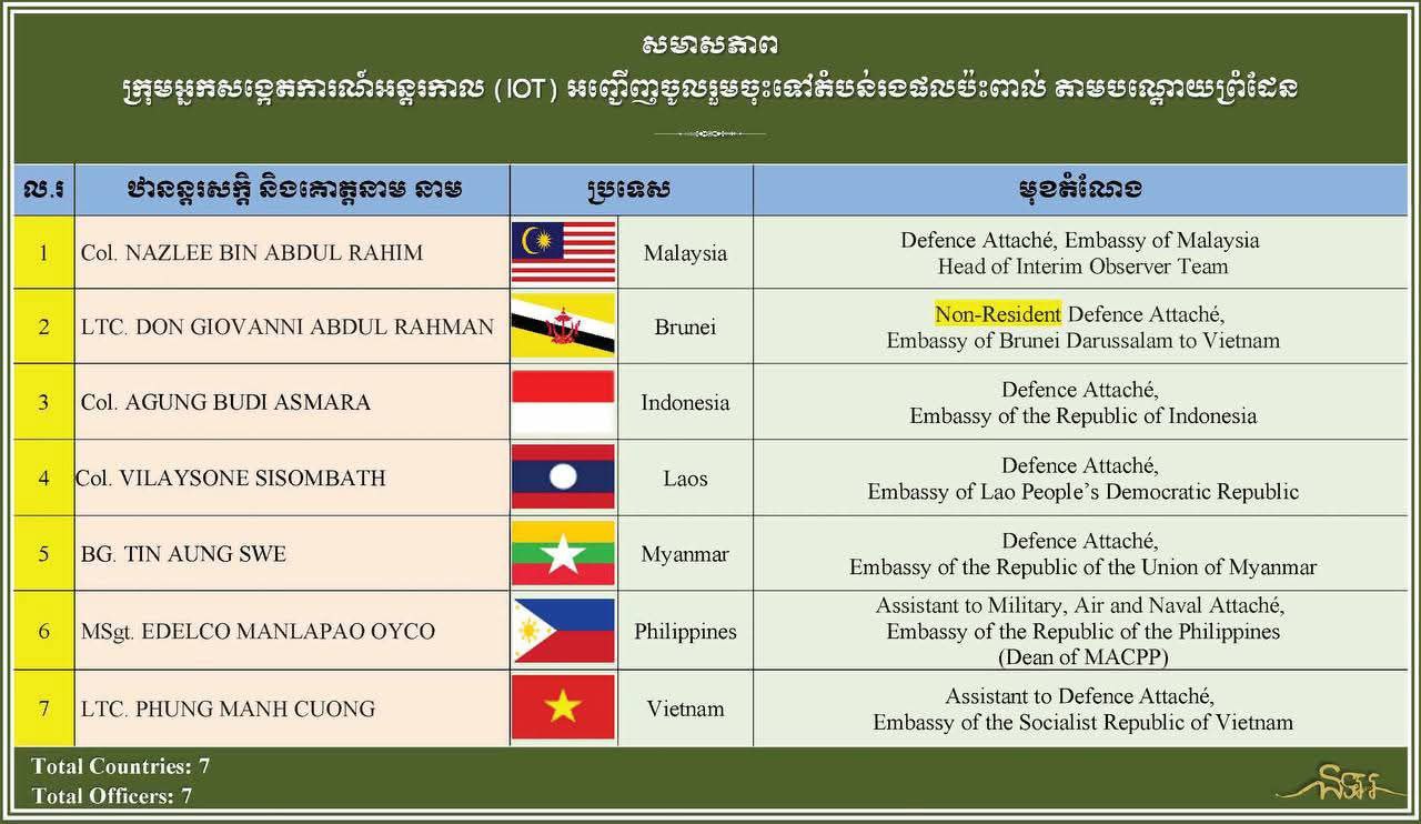 ក្រសួងការពារជាតិ នៃព្រះរាជាណាចក្រកម្ពុជា បានសម្របសម្រួលជូន ក្រុមអ្នកសង្កេតការណ៍អន្តរកាល (IOT) ដឹកនាំដោយ លោកវរសេនីយ៍ឯក NAZLEE BIN ABDUL RAHIM អនុព័ន្ធយោធាម៉ាឡេស៊ី ប្រចាំកម្ពុជា ដែលមានតំណាងមកពីប្រទេសចំនួន ៦ ចូលរួម (ប្រ៊ុយណេ ឥណ្ឌូនេស៊ី ឡាវ មីយ៉ាន់ម៉ា ហ្វីលីពីន និងវៀតណាម) ដែលមាននិវេសនដ្ឋានក្នុង និងក្រៅប្រទេសកម្ពុជា ដោយមានសមាជិកសរុបចំនួន ៧ប្រទេស បានចេញដំណើរទៅកាន់ទីតាំងជាក់ស្តែងផ្សេងៗ ដើម្បីសង្កេតមើលស្ថានភាពសន្តិសុខតាមព្រំដែន ដែលប៉ះពាល់ផ្ទាល់ក្នុងអំឡុងជម្លោះព្រំដែនកម្ពុជា-ថៃ ដូចខាងក្រោម៖