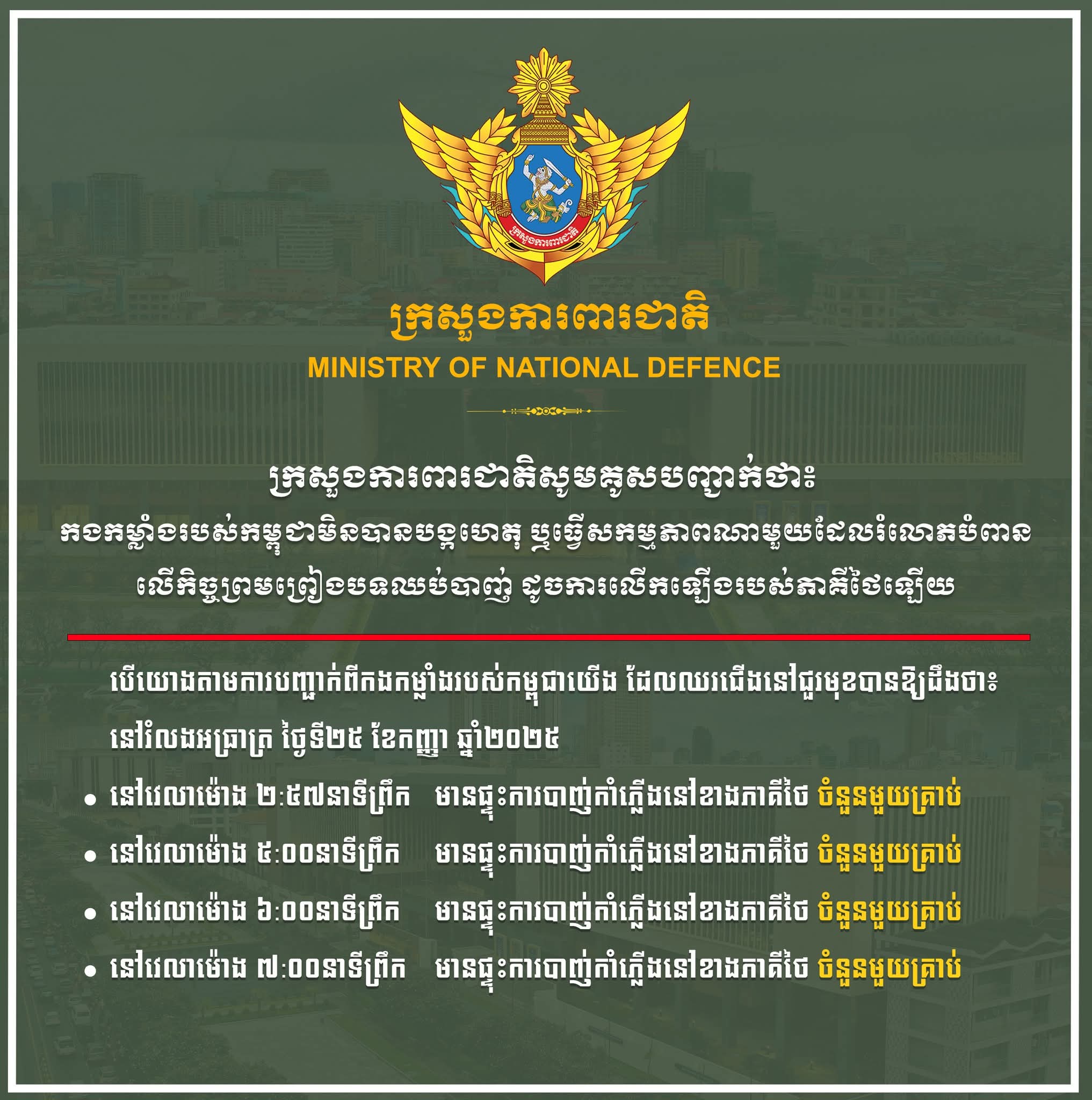 ក្រសួងការពារជាតិ នៃព្រះរាជាណាចក្រកម្ពុជា សូមជម្រាបជូនព័ត៌មានដល់សាធារណជនជាតិ និងអន្តរ ជាតិមេត្តាជ្រាបថា៖ នៅព្រឹកថ្ងៃទី២៥ ខែកញ្ញា ឆ្នាំ២០២៥ មានផេកផ្លូវការរបស់កងទ័ពជើងគោកថៃ និងសារព័ត៌មានរបស់ថៃមួយចំនួនបានចុះផ្សាយថា “កម្ពុជាបង្កហេតុពេញមួយយប់នៅតំបន់យោធភូមិ ភាគទី២” ដោយឮសម្លេងកាំភ្លើង, សម្លេងផ្ទុះគ្រាប់បែក, រកឃើញការចូលជិតលួសបន្លាហើយការបាញ់ ដើម្បីពិនិត្យមើលរយៈចម្ងាយ។